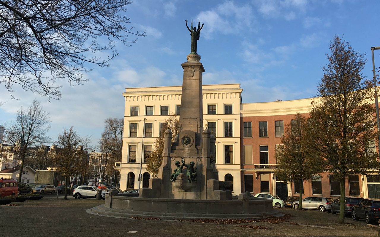 Fontein met obelisk, vrouwenfiguur en twee plaquette's