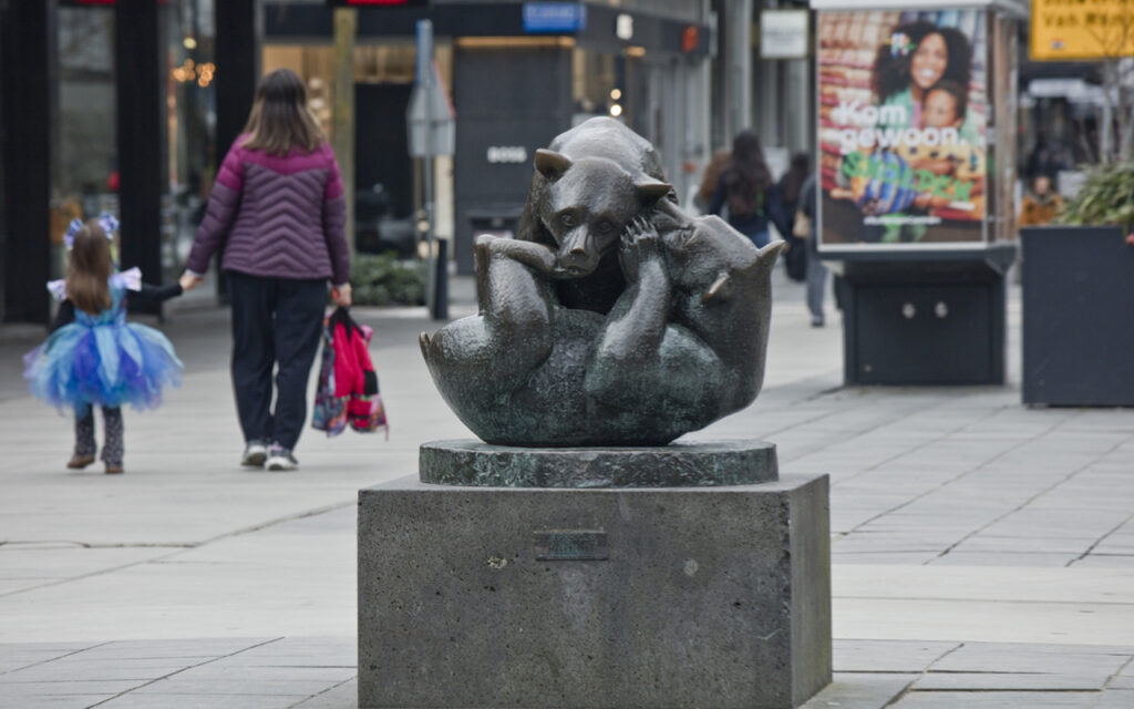 De Spelende beertjes zijn symbolisch voor de hartelijke banden tussen Rotterdam en Oslo. In 1951 kreeg de Maasstad van de Noorse hoofdstad (voor de eerste maal) een kerstboom, een traditie die tot 2014 voortduurde. In 1956 besteedde de net nieuwe Lijnbaan aandacht aan Oslo met een tentoonstelling die werd geopend door de burgemeester van Oslo. Toen de tentoonstelling sloot, kreeg de Vereniging Winkelpromenade van de Noorse ambassadeur dit beeld van twee spelende beertjes aangeboden van de Noorse beeldhouwer Anne Grimdalen. De vereniging schonk het weer aan de Rotterdamse burgemeester Van Walsum, die het werk een definitieve bestemming gaf op de gloednieuwe winkelstraat. Het is een vrolijk beeld dat weliswaar op een sokkel staat, maar toch zo dichtbij de grond dat het lijkt of de beren samen ravotten over de grond. Het bevindt zich op ooghoogte van kleine kinderen, die het werk vaak bijzonder aanspreekt. De twee bronzen dieren vormen samen een compacte bal, waarvan de vorm terugkeert in het ronde plateau waar ze op steunen. De Spelende beertjes passen mooi in het ensemble van bronzen beeldjes op en rond de Lijnbaan, zoals het Lezend meisje en de Trommelslager.