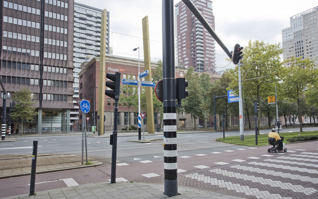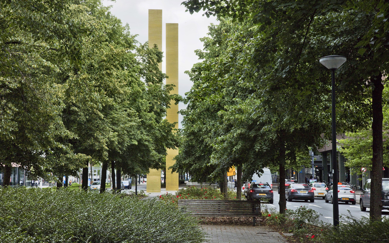 Na de jaren 1940 en 1950, waarin de wederopbouw centraal stond, kwam er een kentering in de jaren 1970: Rotterdam richtte zich op de recreatieve functie. De Blaak zou een gebied worden waarin zowel geflaneerd kon worden door voetgangers, als waar autoverkeer zich kon verplaatsen. Een brede middenberm zou als voetgangersgebied functioneren. Van deze plannen werd later afgezien, maar het voorstel om een kunstwerk te plaatsen werd wel uitgevoerd: de keuze viel op beeldend kunstenaar Lon Pennock om een kunstwerk te ontwerpen. Pennock had lesgegeven aan de Academie van Beeldende Kunsten aan de Blaak 10 en was zodoende vertrouwd met de omgeving. In 1984 werd het beeld The River geplaatst. Twee langwerpige stroken ijzer accentueren de hoogte van 20 meter, staand op de lengte-as van de Blaak en vormen een poort voor voetgangers die de Blaak oversteken. De twee elementen vormen een opvallende verticale bijdrage aan de stedelijkheid van het gebied. Ze doen denken aan obelisken of pilaren in een strakke moderne vormgeving. De beide delen hellen licht voorover, waardoor het beeld spanning krijgt. Door de komst van de Markthal in 2014 veranderde de verkeerssituatie rondom het beeld: er moest een ‘links-af’ komen richting de parkeergarage onder de Markthal. Vanwege de veranderde omgeving van het beeld werd er in samenspraak met de kunstenaar besloten het werk te veranderen van ‘kleur’, zodat het niet weg zou vallen in de gehele entourage. Daarom heeft The River sinds 2013 een goudtint.