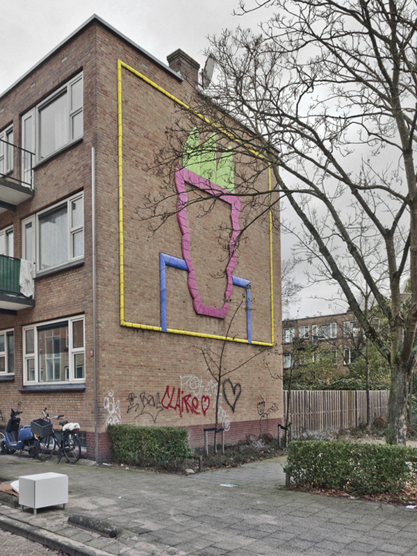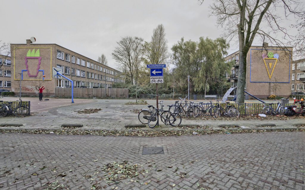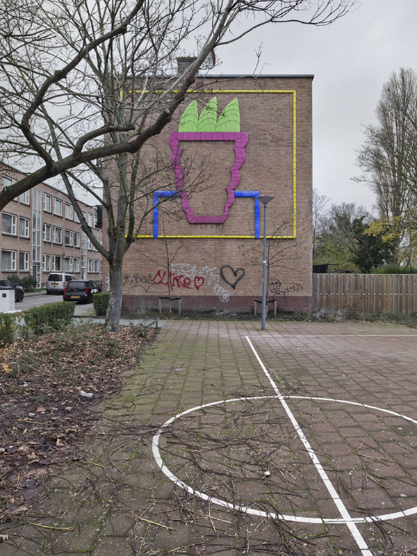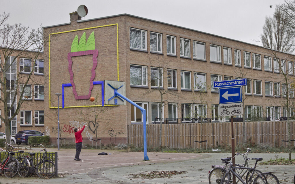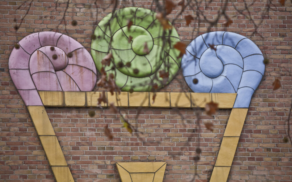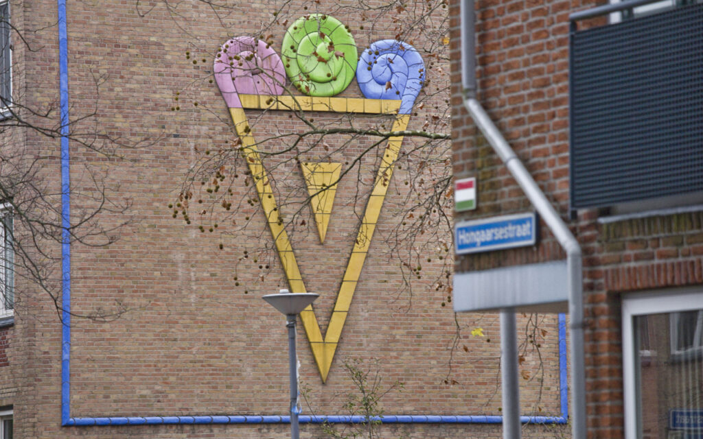 De kunstwerken van kunstenares Dora Dolz (1941-2008) worden getypeerd door kleur, warmte en een overdaad aan weelderige, wulpse vormen. Dolz groeide op in Barcelona en kwam in 1965 naar Rotterdam. Haar typerende fauteuils, waarvan er in Rotterdam meerdere geplaatst zijn, vormden letterlijk en figuurlijk een tegenwicht van het saaie kleurloze Nederlandse klimaat. Op initiatief van de kunstenaar zelf heeft zij in opdracht van de Rotterdamse Kunststichting in 1981 deze twee keramische gevelreliëfs gemaakt. De werken zijn aangebracht op de kopgevels van de Belgischestraat en de Finsestraat, maar ze zijn te zien vanaf het sport- en speelplein aan de Russischestraat. Op het woonblok aan de Belgischestraat zie je een geel vierkant kader van zeven bij zeven meter. Daarin is op een grafische manier een tafel met daarop een plant afgebeeld. Op het woonblok aan de Finsestraat is het vierkante kader van blauw keramiek gemaakt. Daarin staat een ijsje afgebeeld. Dolz heeft in dit werk de alledaagsheid uitvergroot, waardoor er vrolijkheid in het straatbeeld is toegevoegd.