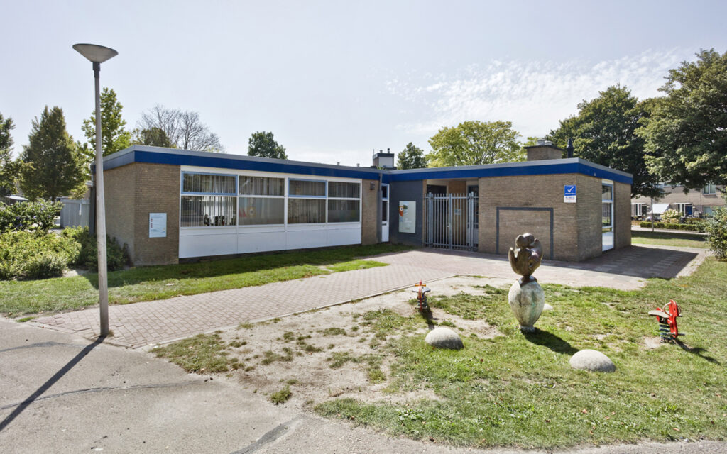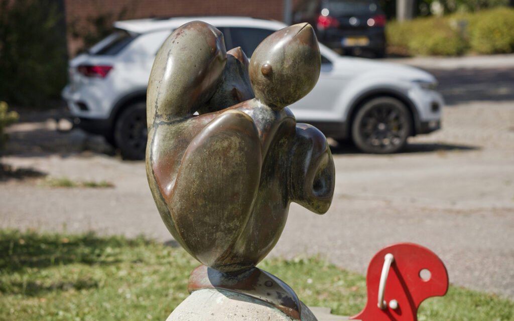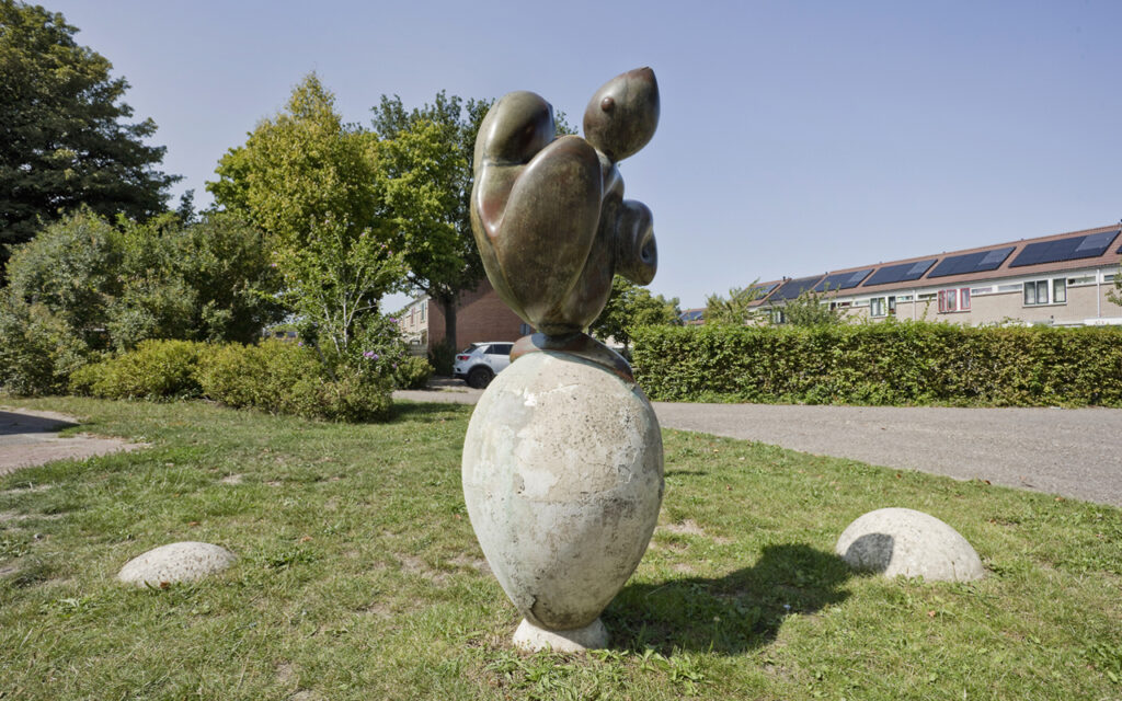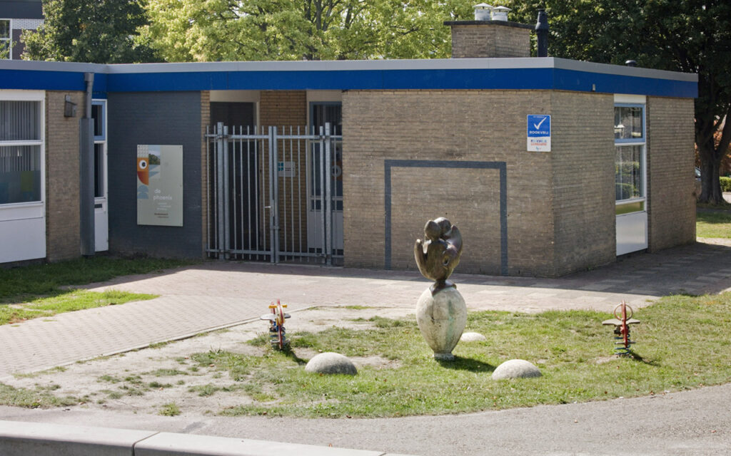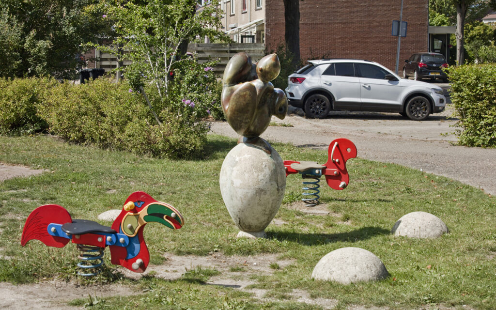 This work The black-tailed godwit on the egg Artist Leo van Oudheusden created this sculpture in the early 1970s, when he was heavily involved in commissions for schoolyards in Rozenburg, which he conceived as environmental design. As a sculptor, he placed a bronze statue of a godwit at the center of the project. The somewhat abstract bird sits on a white concrete egg, standing upright. Three other white eggs lie in the grass around the godwit. The shells surrounding the egg suggest the young bird has just hatched. The theme aligns well with a preschool and/or primary school, where children grow up. This work was designed as a play area and originally stood in a sandbox on a schoolyard, but was later moved to this location near De Phoenix primary school. Playground equipment in the form of a seesaw was also added at a later stage.