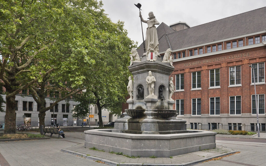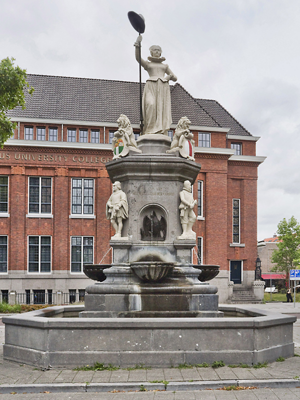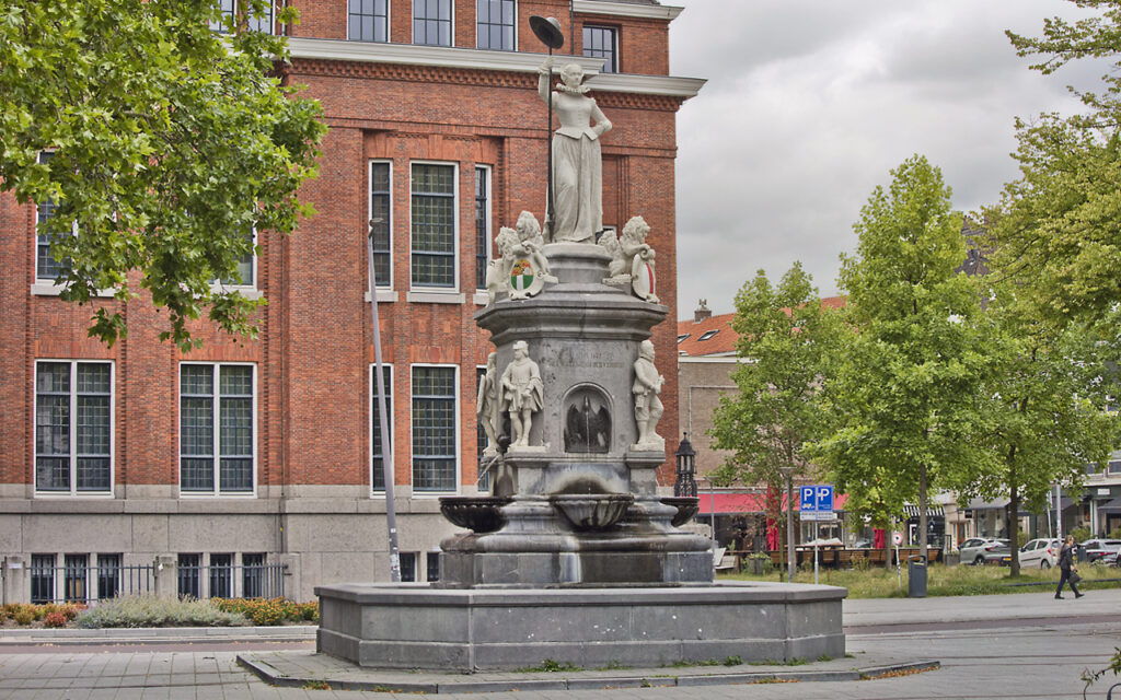 For Dutch standards this is a special statue made by sculptor Joseph Graven. Monument 1872 was unveiled on October 22, 1874 and was intended to serve as the centerpiece of the lavish annual April 1 celebrations. On April 1, 1872, three hundred years after the liberation and capture of Den Briel by the Watergeuzen, the Rotterdammers celebrated a big party with a parade. Not to be forgotten at this party Monument 1872 established. It recounts this revolt against the Spaniards, making it a kind of national monument. At the top, in the middle, is the City Virgin of natural stone, holding a spear with a freedom hat. At her feet on the four corners are small lions, each holding a coat of arms, with the arms of Rotterdam and Brielle in front, and behind them the arms of William of Orange and Holland. On the lowest level are four historical figures from the procession of April 1, 1872. To the left is a medieval burgher with a license and to the right a Watergeus as a reference to 1572. To the right of this a craftsman with hammer and cogwheel, as a symbol of industry. And also a Batavier with a club. Two swans and two fish spew jets of water into shell-shaped catch basins, which overflow into the fountain basin. “Den Briel snatched from Spain, kept for Orange” says one of the inscriptions. Monument 1872 belongs to the identity of the city, just like the Wilhelmina fountain and the Sculpture monument on the Noordereiland. Monument 1872 knows many nicknames, such as it Statue of Liberty, The Virgin of Holland en Kate Mossel.