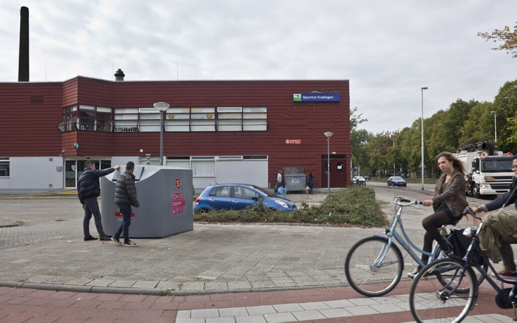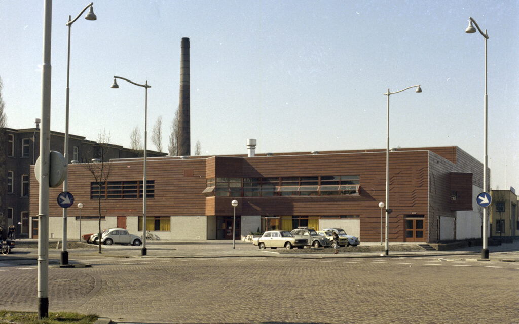 In 1974-1975, the Gerdesiaweg sports hall was built on the corner of Slaak and Gerdesiaweg. Artist Per Abramsen was commissioned, through the percentage scheme, to create an artwork for the sports hall's construction. He created a wooden figuration with wave movements, which covered almost the entire facade of the building. The environmental artwork consists of many wooden planks, all painted a dark brown. In some places, he applied a figurative pattern, such as at the corner of the building where some planks extend forward and others recede. Over time, more and more signs and names were added to the facade, somewhat disrupting the pattern. In 2017, the sports hall was renovated, and the artwork was removed in its entirety.