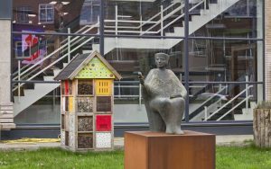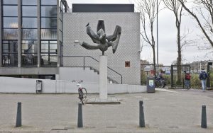 ‘Men kan er iets van een vogel in zien, maar ook van een ontluikende bloem. Loopt men er onderdoor en kijkt men naar boven dan is het een bronzen bril naar het uitspansel,’ zei architect Bakema over de Uitvliegende vogel van Romijn. Deze flamboyante man, omschreven als een ‘eenmanskunstleven’, vloog zelf uit naar een kunstenaarsboerderij vol groen en kunst, aan de rand van de stad.
