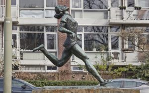 Met een krachtige pose passeert de viervoudig Olympisch kampioene hier de denkbeeldige finish uit 1948. Voor een bronsplastiek maakt de pose het evenwicht juist wankel – dat heeft de beeldhouwer Han Rehm knap gedaan. Buurtbewoners waken over de sportheldin die soms ineens een sportshirt draagt. ‘Mevrouw Blankers, we hebben u vandaag even schoongemaakt. U zat helemaal onder de vogelpoep’, luidt een briefje.