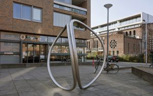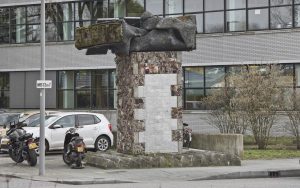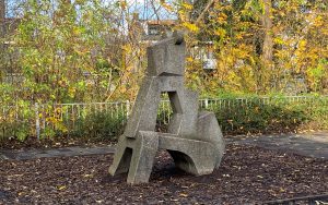 Abstracte kunst? Nee hoor. Dit beeld bestaat uit twee opeengestapelde vogels die van elkaar vandaan vliegen. De lijn van de lijfjes loopt door in de staarten. Blij en enthousiast hadden leerlingen van de bijbehorende school het in bonte kleuren geverfd, maar dat was toch niet de bedoeling. Die kleurlaag is weg, het is nu goud geverfd. Daardoor zien we nog steeds niet de originele steenkleur.
