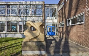 Dit schoolgebouw van gewapend beton is ontworpen met veel glas. Dat geeft openheid en dus wisselwerking tussen het leven binnen én buiten – belangrijk voor de jeugd, die die wereld in moet. De buitengevels zijn dynamisch maar binnen, rond een bloemrijke binnentuin, zijn ze juist rustig. Want ontspanning is ook belangrijk. Dat geldt nog steeds en daarom is de tuin rond het pand recent opnieuw ingericht.