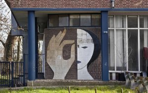 ‘Als je iets wilt maken moet je weg uit Rotterdam’, zei Henk de Vos, een wereldreiziger, die toch terugkeerde in de wederopbouw, en er veel werk vond. Zijn grote reliëfs bevatten eenvoudige en elegante vormen. Een dienstbare en degelijke kunst, want hij vond dat je in opdrachtsituaties ‘je experimentele driften’ moest opgeven. Dit natuurstenen reliëf, letterlijk en figuurlijk een gebaar, geeft diepte aan de architectuur van de toenmalige meisjesschool. Helaas verkeert het in slechte staat.