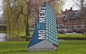 Ter markering van vijftig jaar vrijheid en van de wederopbouw, maakte Diet Wiegman samen met zes basisscholen dit monument. Van voren is het een flatgebouw, strak en netjes. Maar vervolgens lijkt dit alweer af te brokkelen want de achterkant is ruw, als een grot of archeologische vondst – of als verval. Wiegman hield van tegenstellingen en het gevoel voor cycli, veranderlijkheid.