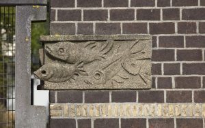 De architect wilde behalve kleur ook reliëf in de gevels, daarom ontwierp Joop Hekman deze stenen. Vissen waren een geliefd wederopbouwmotief, als uitdrukking van een harmonieus leven van mens en natuur, zelfs in de stad of tussen bedrijven. Driftig zwemmen de in beton gegoten visjes de hoek om, de toekomst tegemoet.